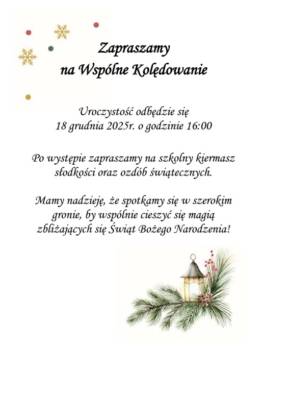 Serdecznie zapraszamy uczniów, rodziców oraz całą społeczność szkolną na Wspólne Kolędowanie, które odbędzie się 18 grudnia 2025 r. o godzinie 16:00 w naszej szkole.